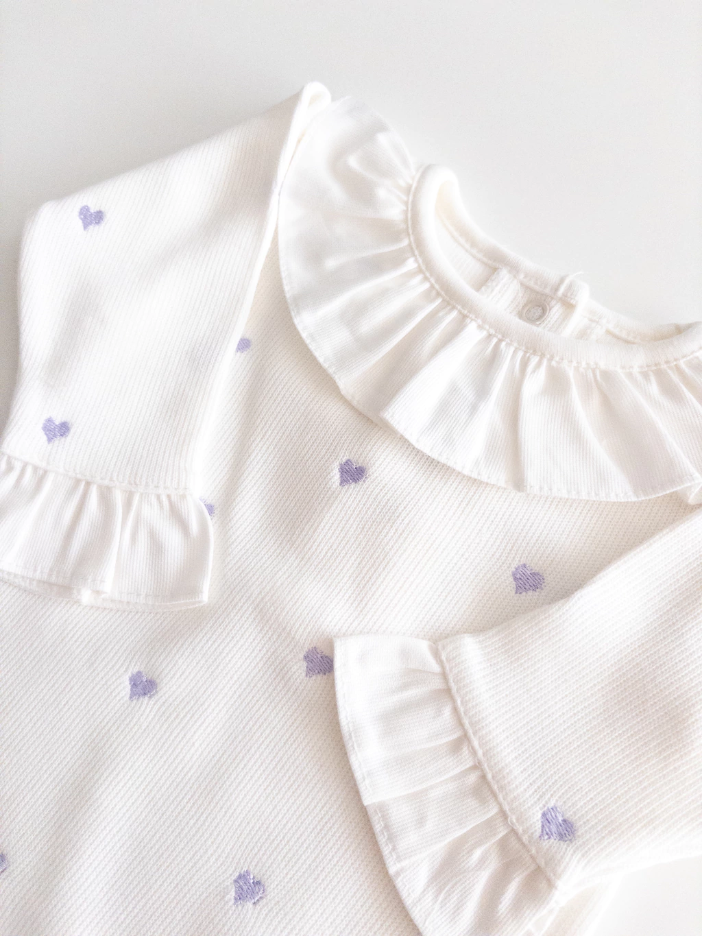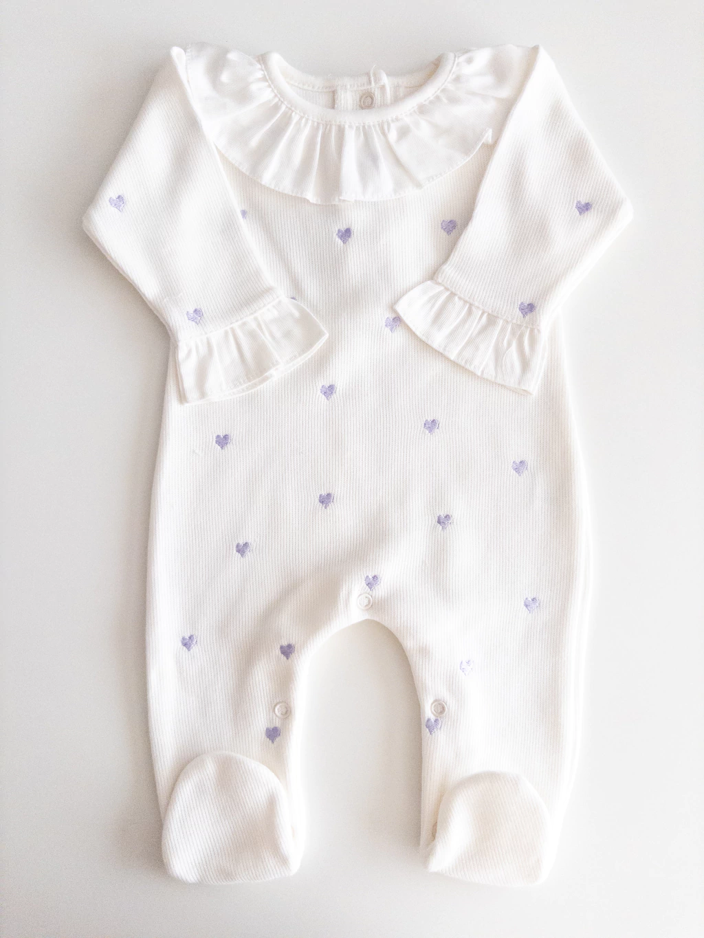 Encante a todos com a elegância e delicadeza do nosso macacão Emma em 100% algodão. Macacão bordado com delicados corações, que evocam pureza e ternura. O macacão oferece praticidade com estilo tornando-o ideal para os primeiros momentos juntos.