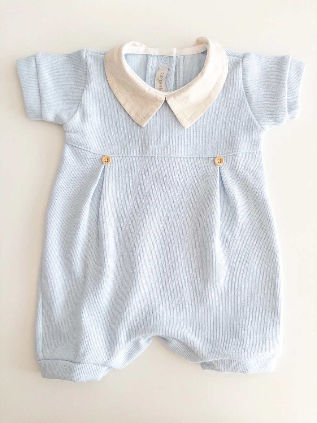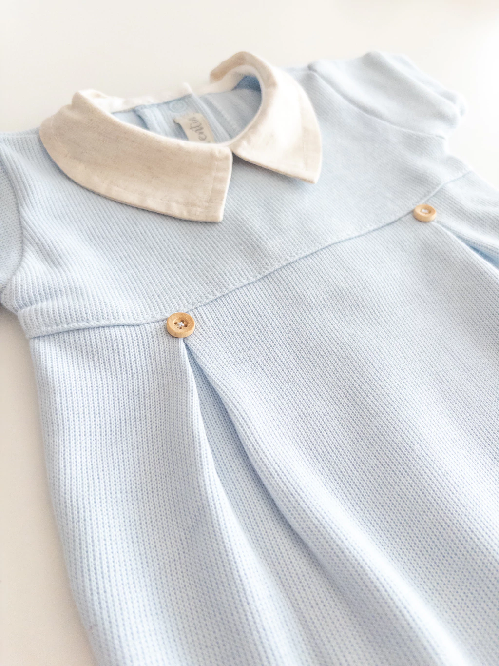 Um adorável romper em 100% algodão, azul claro, com uma elegante gola de linho bege para um toque de sofisticação, feito com detalhes de botôes em madeira, adicionando um charme especial. Feito com materiais macios e confortáveis, este macacão é perfeito para os pequenos aventureiros.