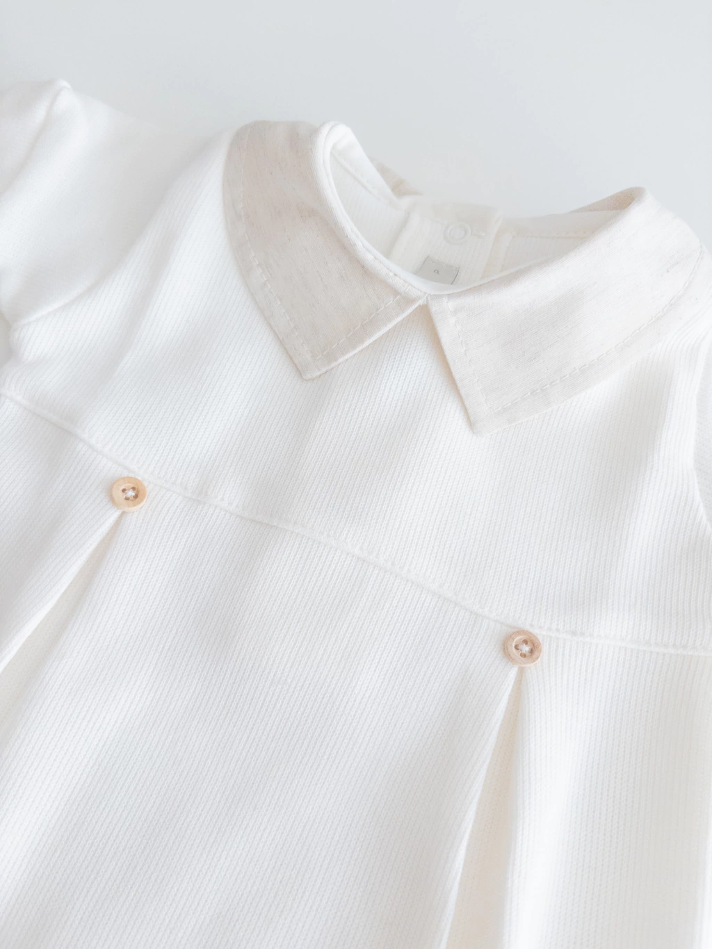 Um adorável romper em 100% algodão, off-white, com uma elegante gola de linho bege para um toque de sofisticação, feito com detalhes de botôes em madeira, adicionando um charme especial. Feito com materiais macios e confortáveis, este macacão é perfeito para os pequenos aventureiros.