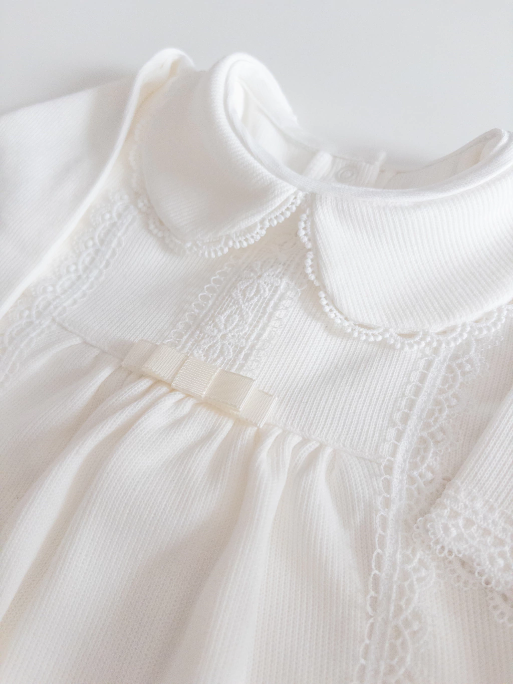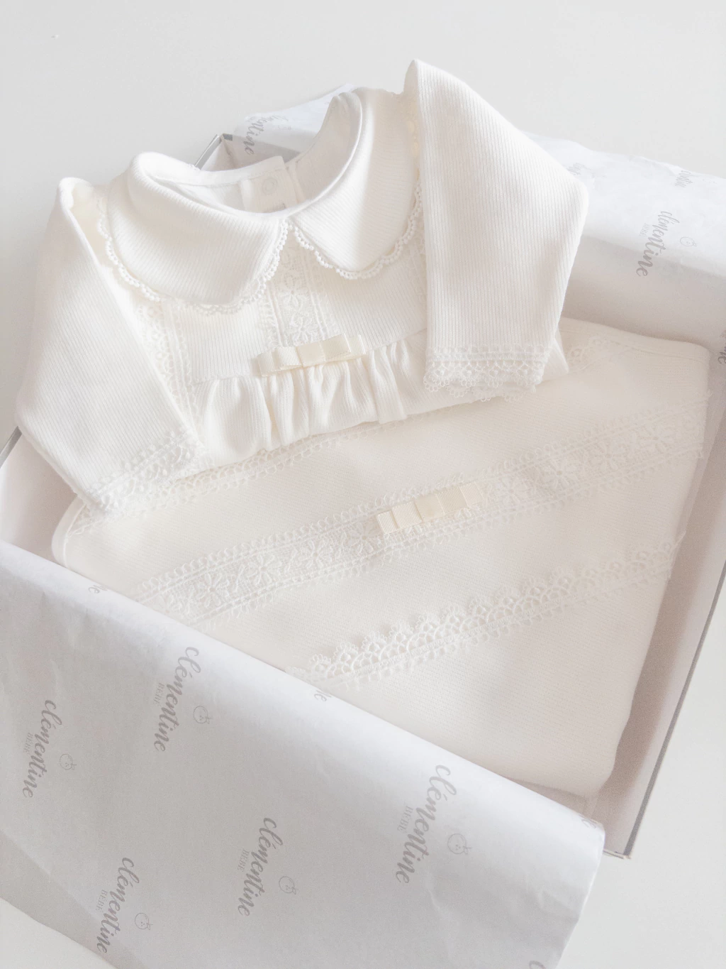 Saída de maternidade Cecília, adornada com detalhes delicados que capturam a essência da pureza e do amor. O toque elegante da renda e o charmoso laço complementam o design, criando uma peça encantadora e acolhedora. Acompanhada por uma manta também decorada com laço e renda, proporciona conforto e estilo desde o primeiro momento. Ideal para criar memórias preciosas e momentos especiais que serão lembrados para sempre. Romântico e delicado.