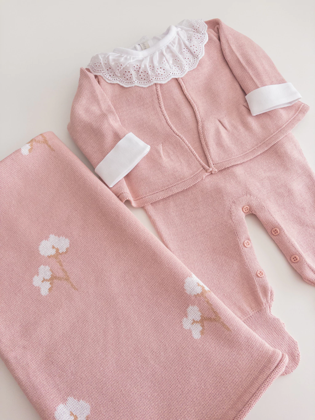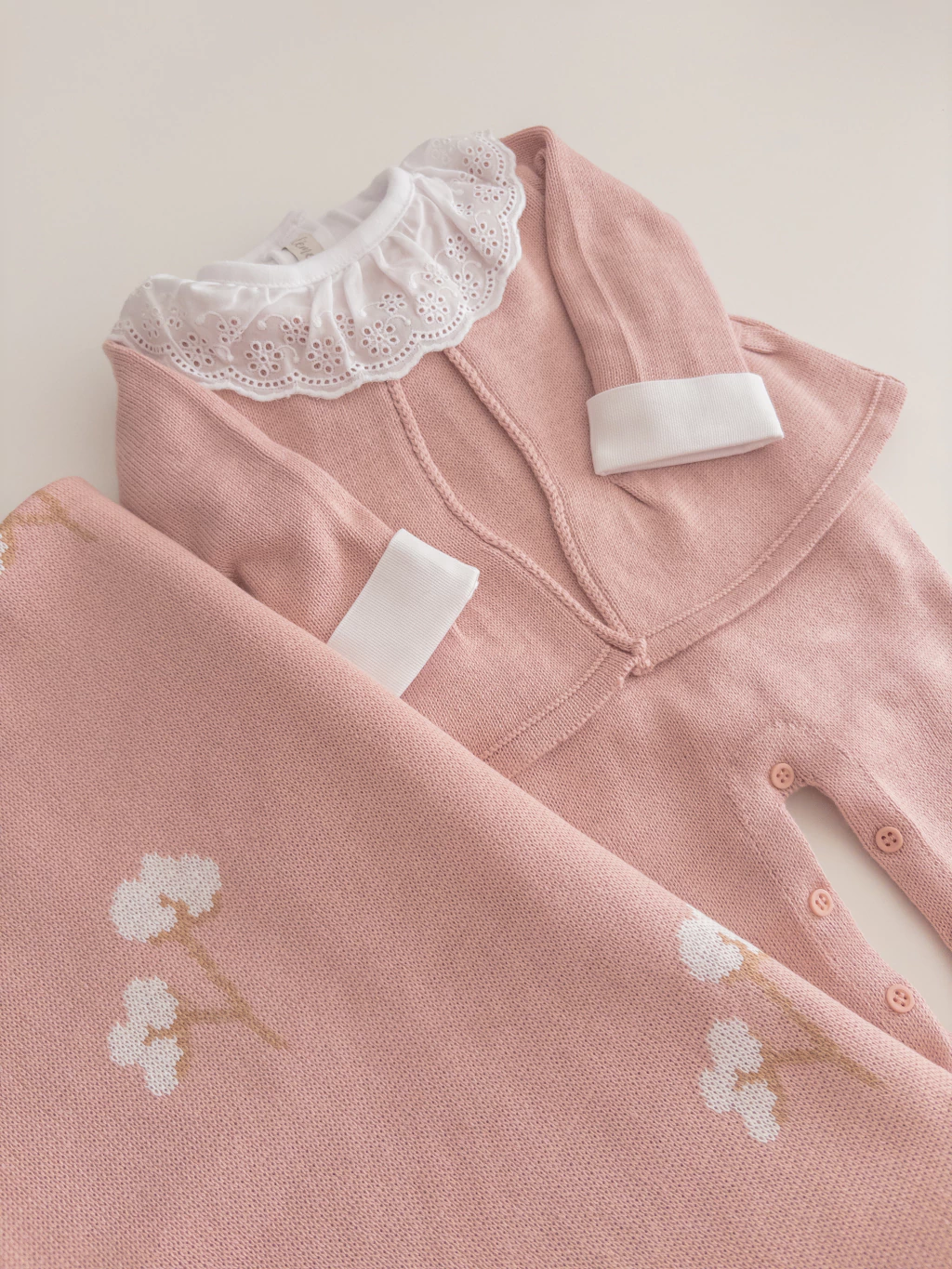Saída de maternidade Floribella. O casaquinho exibe um charme com botão, em tom deslumbrante que se entrelaçam como uma poesia visual.