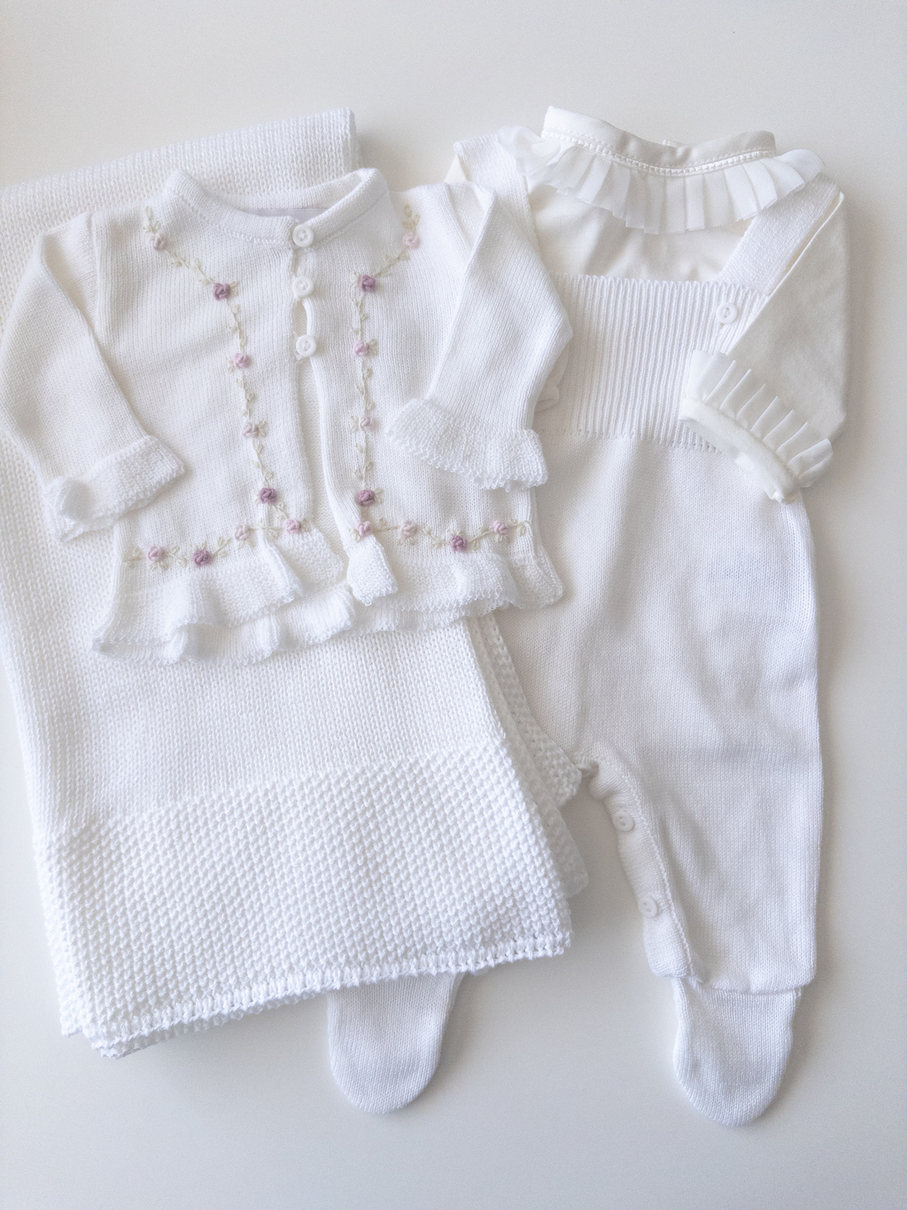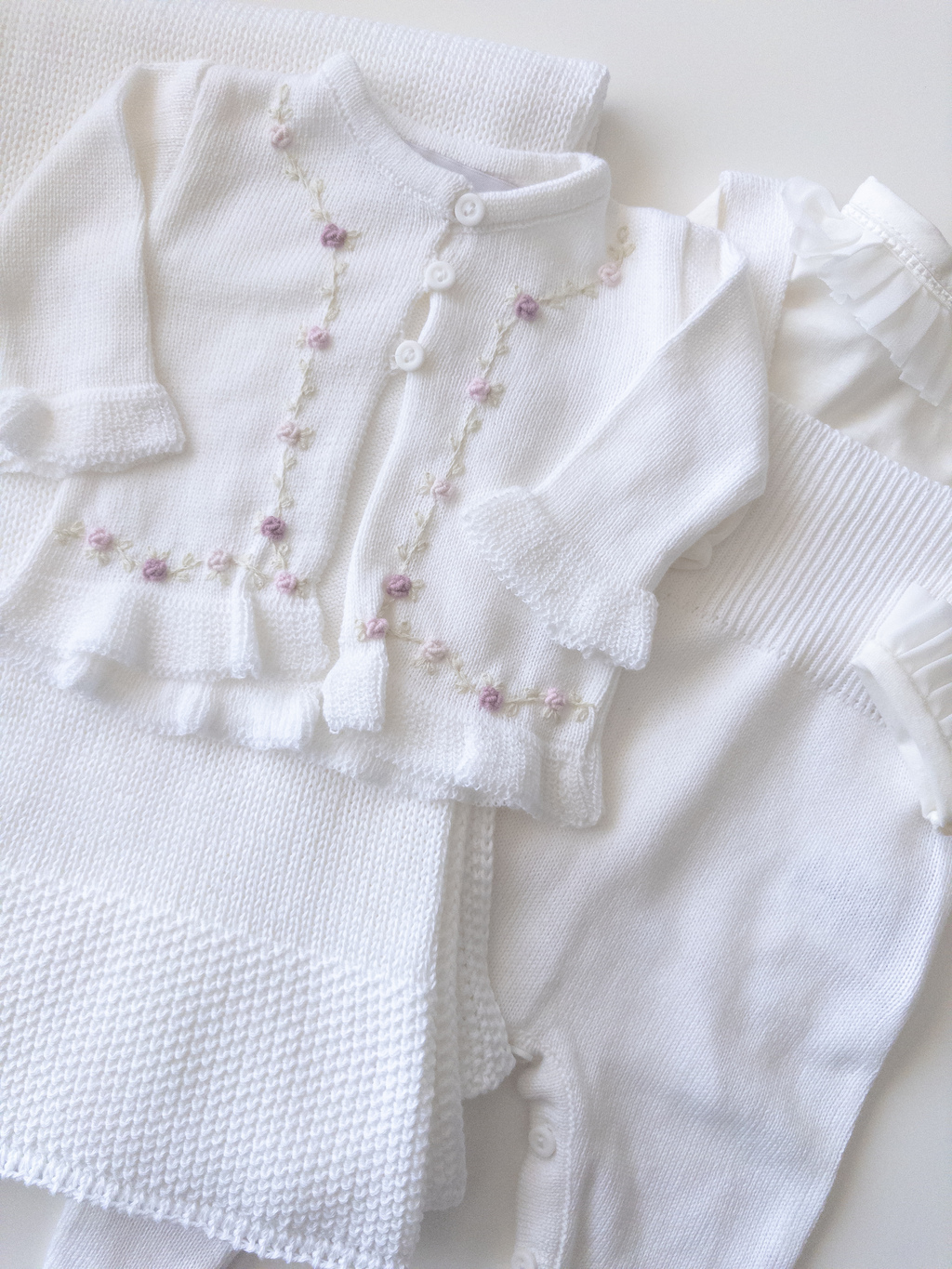 Saída de maternidade Hematita. O casaquinho exibe flores em rococó, em tons deslumbrantes que se entrelaçam como uma poesia visual.