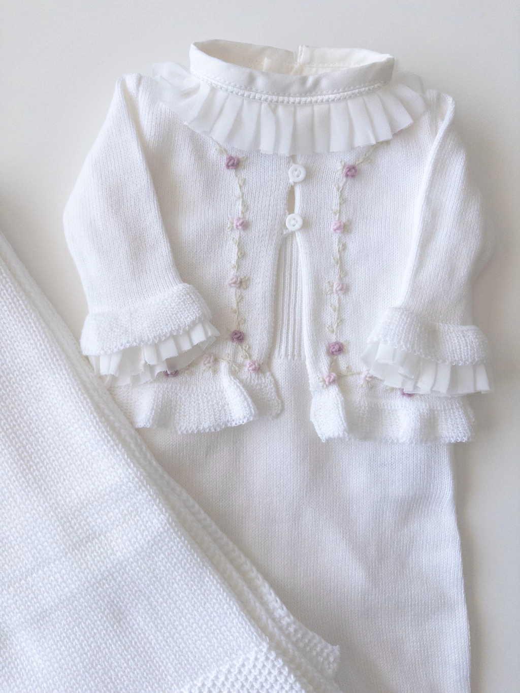 Saída de maternidade Hematita. O casaquinho exibe flores em rococó, em tons deslumbrantes que se entrelaçam como uma poesia visual.