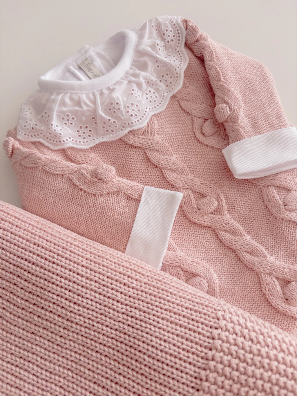 Composição macacão e manta: 50% algodão e 50% acrílico.