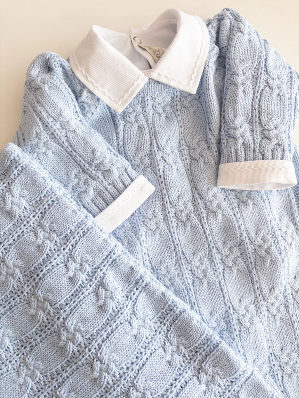 Saída de maternidade Siena. Este conjunto encantador inclui um body com viés de tricô na gola adicionando um charme especial e uma sensação de delicadeza. Cada detalhe foi cuidadosamente pensado para oferecer não apenas beleza estética, mas também funcionalidade e suavidade para a pele sensível do recém-nascido. Esta saída de maternidade é perfeita para criar lembranças inesquecíveis.